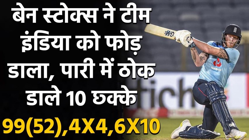 पुणे। तीन वनडे मैचों की सीरीज को अब रोमांचक मोड़ पर लाने के लिए इंग्लिश बल्लेबाजों ने दूसरे वनडे में धमाकेदार प्रदर्शन किया। सबसे ज्यादा प्रहार बेन स्टोक्स के बल्ले से देखने को मिला जिसकी वजह से भारत से मिला विशाल लक्ष्य भी बाैना साबित हो गया। जी हां, स्टोक्स भले ही 1 रन से शतक बनाने से चूक गए हों, लेकिन उनकी पारी ने ही सारा मैच बदलने की क्षमता रखी। उन्होंने 52 गेंदों में ताबड़तोड़ 99 रन बनाए जिसमें 4 चाैके तो 10 दनदनाते छक्के शामिल रहे।