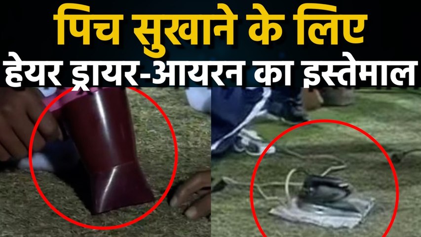 गुड लैंथ स्पॉट पर पानी के पहुंचने की वजह से मैच शुरू करना खतरनाक था, इसके चलते पिच के हिस्से को सुखाने का काम शुरू किया गया। दर्शक यह देखकर हैरान रह गए कि इसके लिए पहले वैक्यूम क्लीनर का इस्तेमाल किया गया। इसके बाद प्रेस (स्टीम आयरन) और हेयर ड्रायर का इस्तेमाल किया गया। हालांकि पिच पर इनकी हीट देने के बावजूद भी कोई फर्क नहीं पड़ा क्योंकि मामला रात का था और पिच पर नमी भी मौजूद थी इसके चलते ये कारगर साबित नहीं हुए।