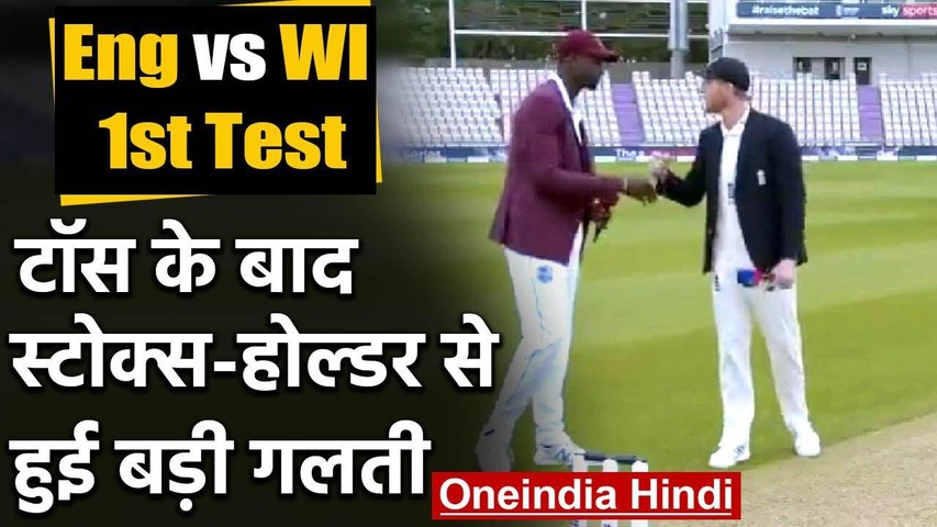 साउथैम्पटन के मैदान पर बारिश के खलल के बावजूद लंच के बाद टॉस हो सका। इसे इंग्लैंड के कप्तान बेन स्टोक्स ने जीता और पहले बल्लेबाजी करने का फैसला किया। इस दौरान होल्डर आईसीसी की ओर से बनाये गये सुरक्षा नियमों में से पहला नियम खुद ही भूल गये। दरअसल टॉस के दौरान दोनों कप्तान ने सोशल डिस्टेंसिंग का पालन करते हुए दूरी बनाकर रखी थी लेकिन बेन स्टोक्स के टॉस जीतने के बाद उन्हें बधाई देने के लिये हाथ मिला बैठे। होल्डर भले ही नियम को भूल गये थे लेकिन स्टोक्स को नियम याद था इसलिये उन्होंने हैंड शेक के बजाय मुट्ठी आगे बढ़ाई, जिसे देखकर होल्डर को नियम याद आया और इसे देखकर वहां मौजूद सभी लोग हंसने लगे।