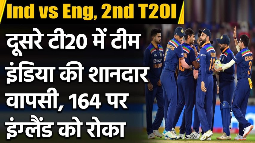 India vs England 2nd T20I England Sets 165 runs Target to win for India at Motera in 2nd Match at Ahmedabad: नई दिल्ली। भारत और इंग्लैंड के बीच जारी 5 मैचों की टी20 सीरीज का दूसरा मैच अहमदाबाद के मोटेरा मैदान पर खेला जा रहा है, जहां पर भारतीय टीम ने टॉस जीतकर पहले गेंदबाजी करने का फैसला किया। इंग्लैंड की टीम ने इस मैच में एक बार फिर शानदार शुरुआत की लेकिन आखिरी ओवर्स में भारतीय गेंदबाजों ने जबरदस्त वापसी कराते हुए इंग्लैंड की टीम बड़ा स्कोर खड़ा करने से रोका और निर्धारित 20 ओवर्स में इंग्लैंड की टीम 164 रन ही बना सकी। दूसरे मैच में जीत हासिल करने के लिये भारत की टीम को 165 रनों की दरकार है।