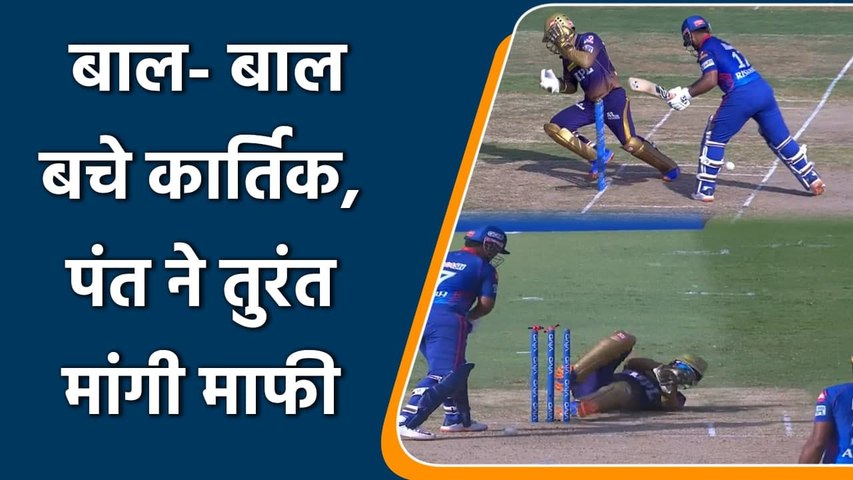 यह मामला दिल्ली कैपिटल्स की पारी के 17वें ओवर का है जब वरुण चक्रवर्ती पहली गेंद कर रहे थे और पंत ने शॉट मारने की कोशिश की लेकिन गेंद विकेट के पीछे चली गई। पंत को लगा कि गेंद विकेट में जा रही है और उन्होंने उसको रोकने के लिए बल्ला चलाया जो कि दिनेश कार्तिक के सर के काफी करीब से गुजरा। दिनेश कार्तिक की तारीफ करनी होगी कि उन्होंने बहुत ही मामूली अंतर से अपने आप को बचाया है। हालांकि कार्तिक ऋषभ पंत से बिल्कुल भी खुश नहीं दिखे और उन्होंने गुस्से में पंत की ओर देखकर अपनी नाराजगी जाहिर की। जबकि पंत एक मासूम बच्चे की तरह से उनके सामने माफी मांगते रहे, खुशामद निकालते रहे।