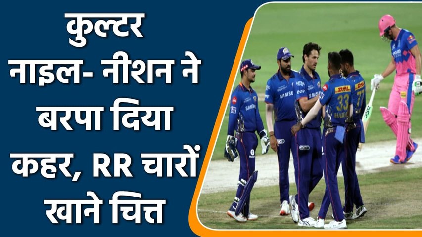 राजस्थान की ओर से एविन लुईस और यास्वी जायसवाल ने पहले बल्लेबाजी करते हुए पारी की शुरुआत की। यह जोड़ी ज्यादा दिन नहीं चली। नाथन कूल्टर नाइल के खिलाफ चौथे ओवर में जायसवाल 12 रन पर आउट हुए। 6वें ओवर में लुईस को जसप्रीत बुमराह ने 24 रन पर लपका। राजस्थान के कप्तान संजू सैमसन भी कुछ खास नहीं कर सके। उन्हें जयंत यादव ने जिमी निशाम की गेंद पर 7वें ओवर में 3 रन पर लपका। शिवम दुबे को 9वें ओवर में निशन ने बोल्ज किया। दुबे भी 3 रन ही बना सके। 10वें ओवर में कूल्टर नाइल ने ग्लेन फिलिप्स को पवेलियन भेजा। उन्होंने 13 गेंदों में 4 रन बनाए। नतीजतन, राजस्थान ने 10 ओवर में 50 रन पर 5 विकेट खो दिए।